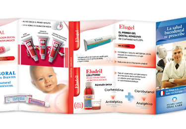 Folleto de presentación para profesionales de la extensa línea de Salud Bucal de Pierre Fabre. Por medio de un doblado tipo “acordeón” asimétrico se generan solapas para presentar, con un código de colores, los diferentes grupos de productos con un espacio propio.