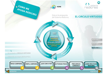 El CD integra el pack de Redicres, un producto innovador para el control de peso, y contiene herramientas para personalizar el tratamiento, obtener el índice de masa corporal, etc. Para eso desarrollamos una interfaz muy clara, organizada en pasos, con una imagen seria, natural y colorida.