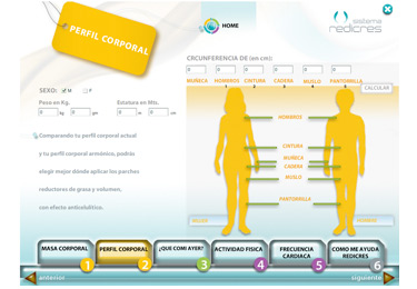 El CD integra el pack de Redicres, un producto innovador para el control de peso, y contiene herramientas para personalizar el tratamiento, obtener el índice de masa corporal, etc. Para eso desarrollamos una interfaz muy clara, organizada en pasos, con una imagen seria, natural y colorida.