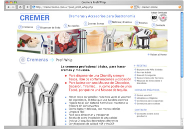 Realizado para una empresa pequeña especializada en un producto muy específico (las cremeras, o dispensadores de cremas), el sitio apunta a ser una experiencia de venta, y plantea rápidamente los principales diferenciales del producto, con una estética simple y suelta.